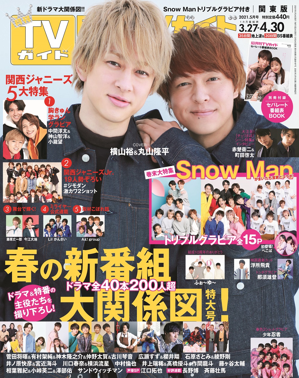 #月刊TVガイド 5月号 3/24発売 表紙公開 #横山裕 #丸山隆平 ほっこり笑顔😍 関西SP #ジャニーズWEST #ジモダン #藤原丈一郎 #今江大地 巻末特集 #SnowMan トリプルグラビア 春色 #少年忍者 注目 #相葉マナブ #赤楚衛二 #町田啓太 #江口拓也 春ドラマ関係図 ご予約