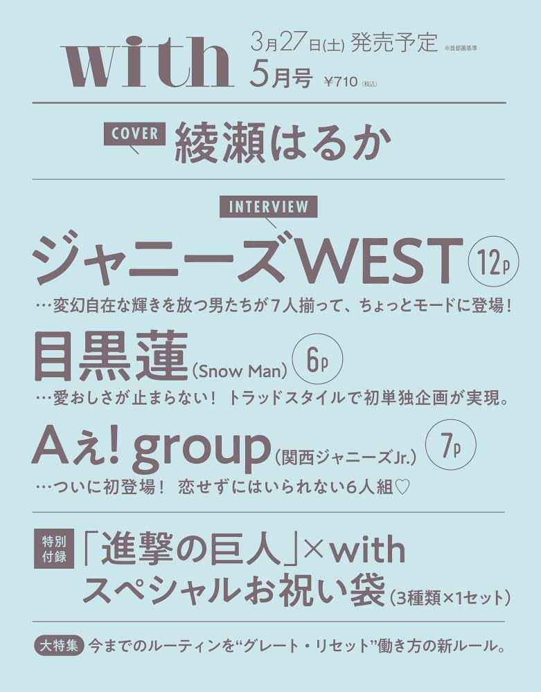 with5月号予約開始のお知らせ📚✨ *表紙 #綾瀬はるか さん *付録 #進撃の巨人×with スペシャルお祝い袋 *Interview ジャニーズWEST 目黒蓮(Snow Man) Aぇ! group(関西ジャニーズJr.) ●セブン ●タワレコ #ジャニーズWEST #目黒蓮 #Aぇgroup