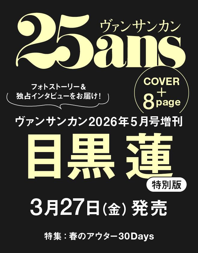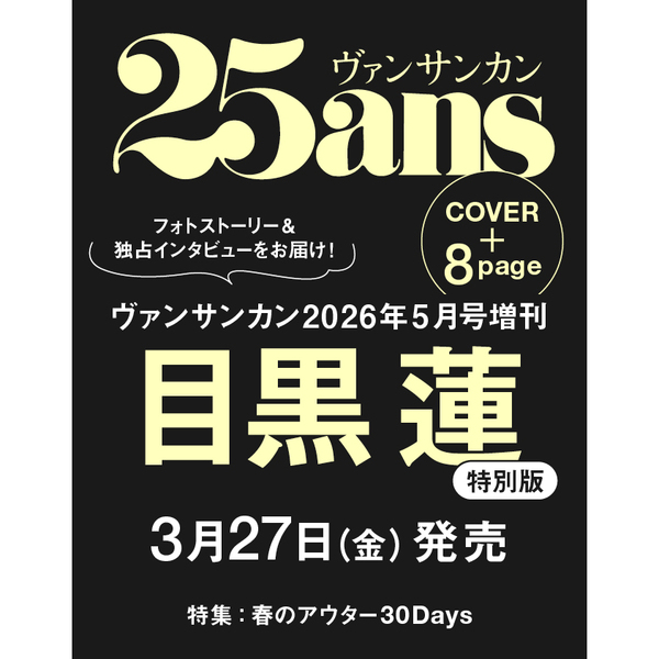 全まとめTV出演雑誌掲載公式YouTubeメンバー個別ページ過去出演番組雑誌予約早見表 【雑誌】3/27(金) 目黒蓮「25ans 2026年5月号増刊」発売スポンサーリンク雑誌 2026.02.162026年3月27日(金) 「25ans 2026年5月号増刊」に目黒蓮が掲載されます。表紙+8P:目黒蓮25ans 2026年5月号増刊25ans 2026年5月号増刊created by Rinker 表紙+8P:目黒蓮Amazon楽天市場Yahooショッピングセブンネットタワレコ一覧まとめSnow Man 2月テレビ一覧Snow Man 2月全スケジュールまとめ雑誌予約まとめトップページ