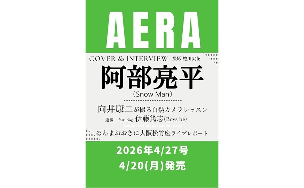 全まとめTV出演雑誌掲載公式YouTubeメンバー個別ページ過去出演番組雑誌予約早見表 【雑誌】4/20(月) 阿部亮平「AERA (アエラ) 2026年 4/27 号」発売スポンサーリンク雑誌 2026.04.022026年4月20日(月) 「AERA (アエラ) 2026年 4/27 号」に阿部亮平が掲載されます。★COVER&INTERVIEW 阿部亮平 ★連載 向井康二が撮る 白熱カメラレッスンAERA (アエラ) 2026年 4/27 号AERA (アエラ) 2026年 4/27 号created by Rinker朝日新聞出版 ★COVER&INTERVIEW 阿部亮平 ★向井康二が撮る 白熱カメラレッスンAmazon楽天市場Yahooショッピングセブンネットタワレコ一覧まとめSnow Man 4月テレビ一覧Snow Man 4月全スケジュールまとめ雑誌予約まとめトップページ